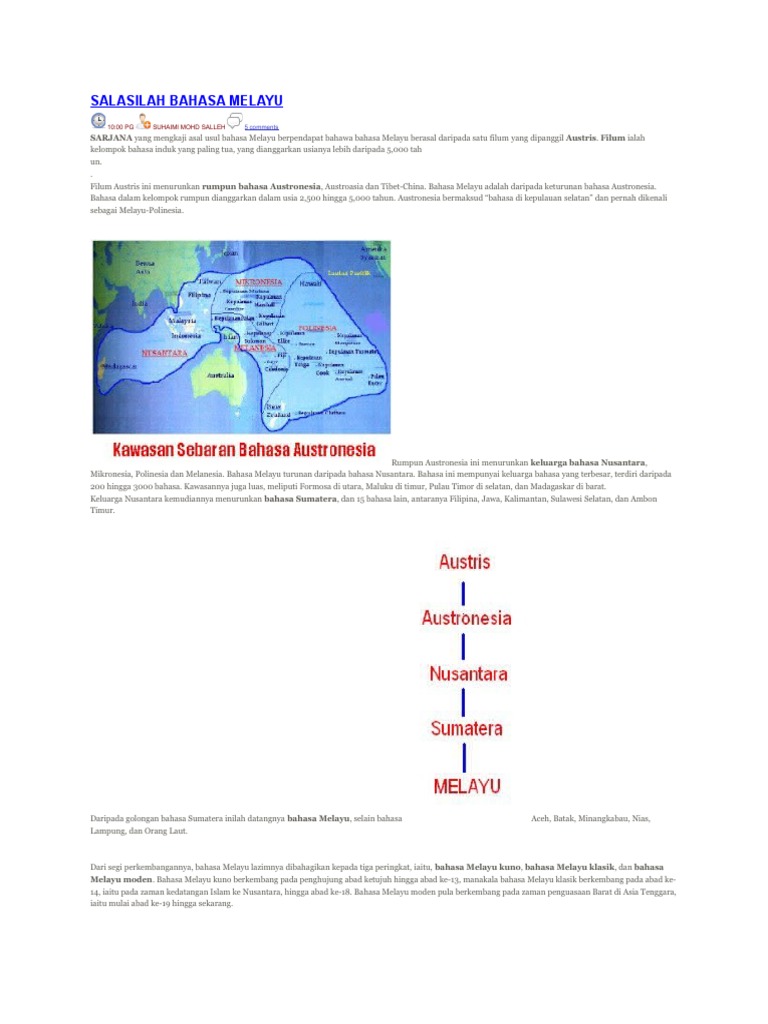 Salasilah BM ialah kajian tentang as al usul keturunan BM. Filum Austris ini menurunkan rumpun bahasa. 113 Hipotesis tentang Tempat Asal Bahasa Melayu Terdapat dua hipotesis tentang asal bahasa Melayu iaitu.