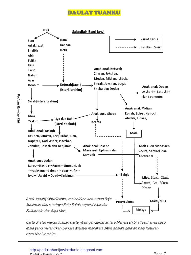 Nuh Salasilah Bani Jawi Zuriat Terus Sam Ham Arfakhazat Kanaan Langkau Zuriat Shalikh Heth Abir Falikh Rau Saru Anak-anak Keturah Nahur Zimran Jokshan Azar Medan Midian Ishbak Ibrahim KeturahJawi Shuah Jokshan begat Anak-anak Dedan isteri Ibrahim Sheba dan Dedan Asshurim Letushim Paduka Ramizu 786. Kini Yahudi telah mengetahui di manakah. Bani jawi yang hilang.